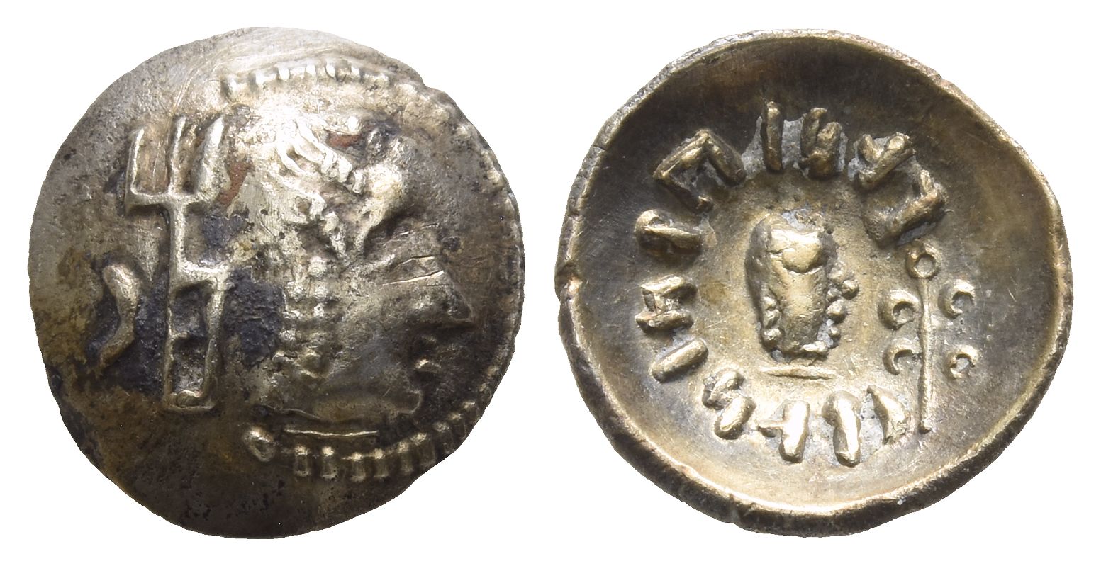 Head to right within dotted circle interrupted by monogram to left / Small head to right; 'sceptre' to right. CAF 3.4i; Huth 441; SNG ANS 1595. 1.17gr, 14mm, 2h.