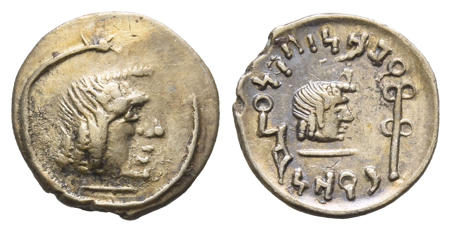 Head to right within circular torque / Small head to right; yanaf-monogram to left, 'sceptre' to right. CAF 3.2ai; Huth 429. 1.04gr, 14mm, 8h.