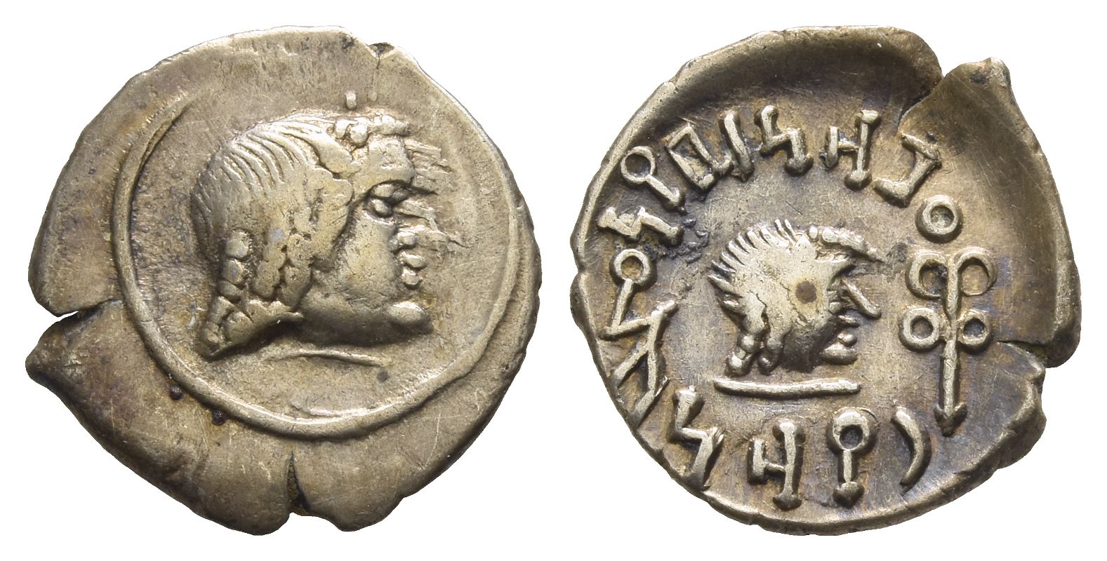 Head to right within circular torque / Small head to right; yanaf-monogram to left, 'sceptre' to right. CAF 3.2ai; Huth 429. 1.27gr, 15mm, 2h.