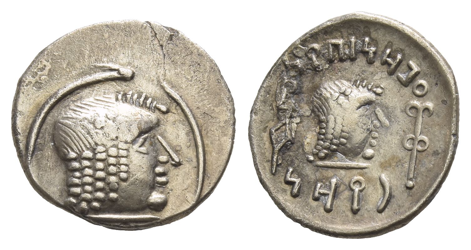 Head to right within circular torque / Small head to right; yanaf-monogram to left, 'sceptre' to right. CAF 3.2ai; Huth 429. 1.35gr, 15mm, 3h.