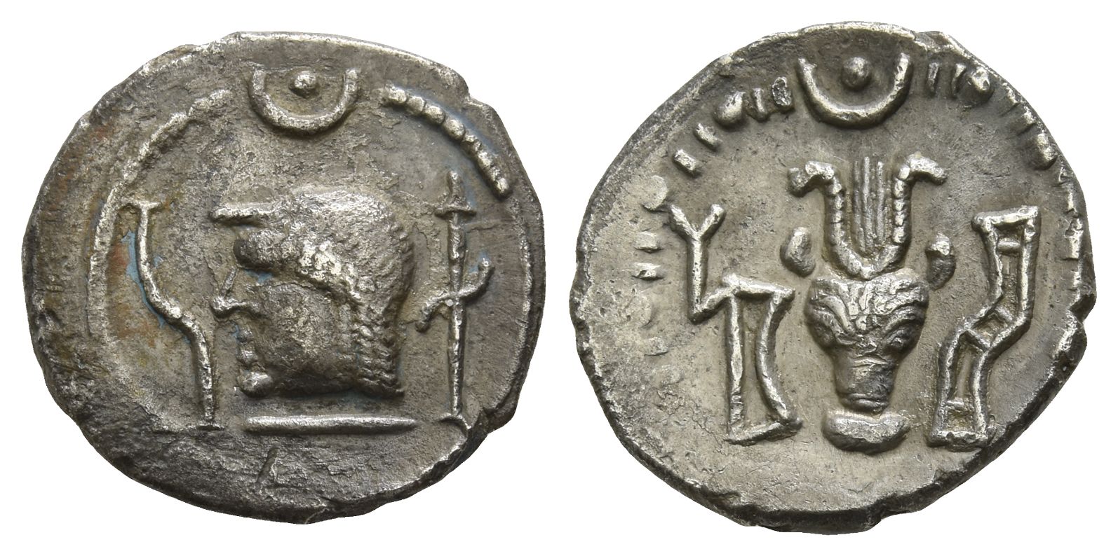 'Bucranium Series'. Diademed male head to left; curved symbol of Almaqah to left, symbol of Athtar to right; disc-crescent of Dhat-Hamim above / Head of antelope facing; monogram to left, curved symbol of Almaqah to right; disc-crescent of Dhat-Hamim above. CAF 2.2i; Huth 302-3; SNG ANS 1503-13. 3.03gr, 17mm, 7h.