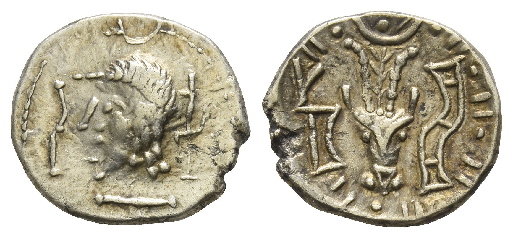 'Bucranium Series'. Diademed male head to left; curved symbol of Almaqah to left, symbol of Athtar to right; disc-crescent of Dhat-Hamim above / Head of antelope facing; monogram to left, curved symbol of Almaqah to right; disc-crescent of Dhat-Hamim above. CAF 2.2i; Huth 302-3; SNG ANS 1503-13. 2.55gr, 17mm, 12h.