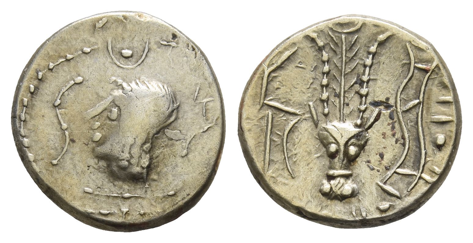 'Bucranium Series'. Diademed male head to left; curved symbol of Almaqah to left, symbol of Athtar(?) to right; disc-crescent of Dhat-Hamim above / Head of antelope facing; monogram to left, curved symbol of Almaqah to right; disc-crescent of Dhat-Hamim above. Cf. CAF 2.2i; cf. Huth 302-3. 2.39gr, 15mm, 11h.