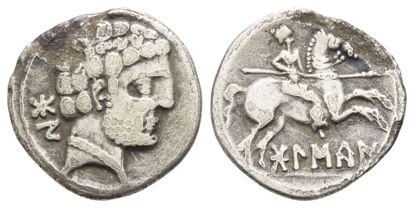 BoN (in Iberian) behind bearded male head to right, wearing pearl necklace / BoLSCaN (in Iberian) beneath horseman with couched lance galloping to right. ACIP 1423; CNH 212/13; MIB 79/11c; SNG BM Spain 710-33; Vives 43/2. 3.15gr, 20mm, 12h.