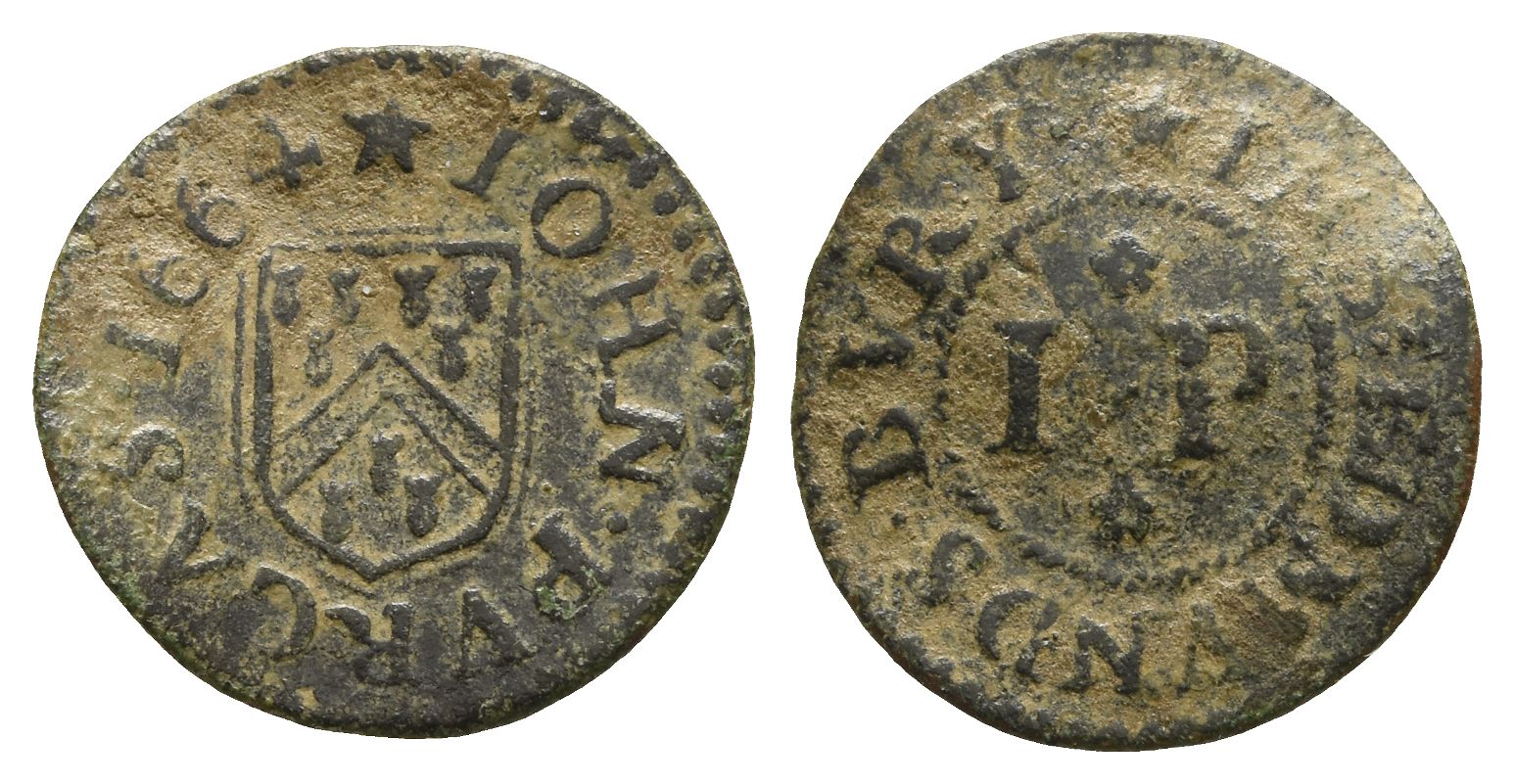 IOHN PVRCAS 1664, grocer's arms / IN ST EDMVNDS BVRY, initials. Dickinson p.204, 72. 0.81gr, 16mm, 3h.