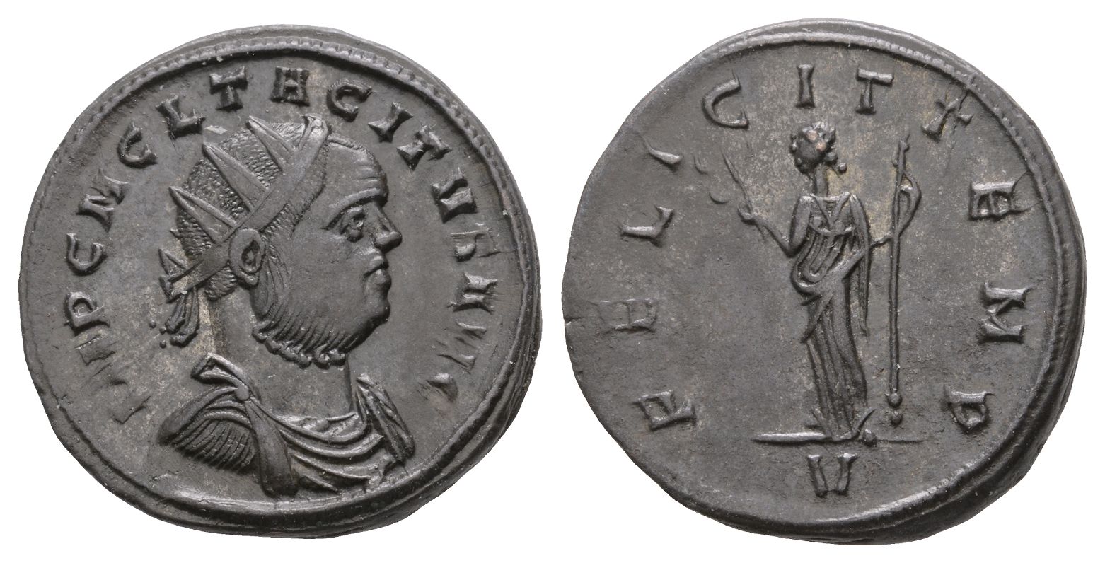 Ticinum mint. Struck AD 276. 5th officina. IMP C M CL TACITVS AVG, radiate, draped and cuirassed bust to right / FELICIT TEMP, Felicitas standing facing, head to left, holding caduceus with right hand and sceptre with left; V in exergue. RIC V.1 140; MER-RIC 3442 (temporary). 4.42gr, 22mm, 12h