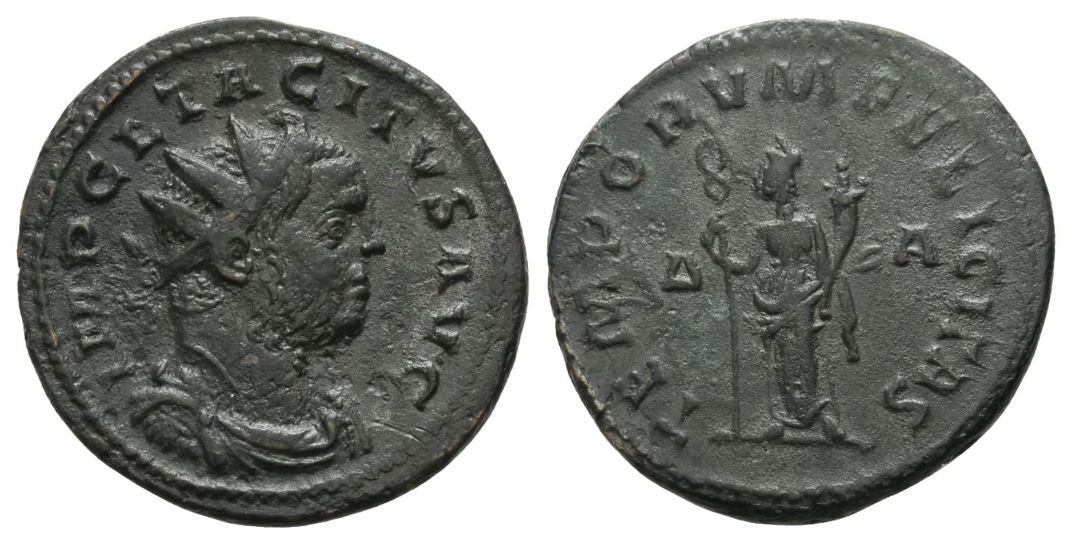 Lugdunum mint; struck AD 276. 4th officina. IMP CL TACITVS AVG, radiate, draped and cuirassed bust to right / TEMPORVM FELICITAS, Felicitas standing to left, holding caduceus and cornucopia; Δ-A across fields. RIC V.1 65; MER-RIC 3314 (temporary). 4.82gr, 23mm, 6h.