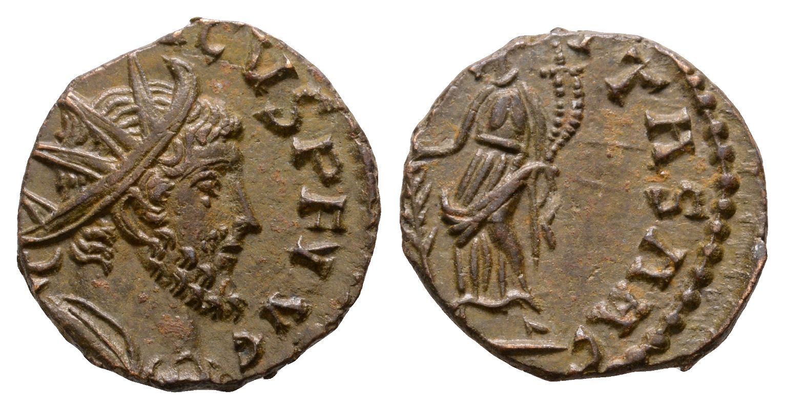 Local imitation. [...]CVS P F VVG, radiate, draped and cuirassed(?) bust to right / [...]ITAS AAG, Hilaritas standing facing, head to left, holding long branch with right hand and cornucopia with left. For prototype, cf. RIC V.2 80 (Treveri). 2.07gr, 16mm, 8h.