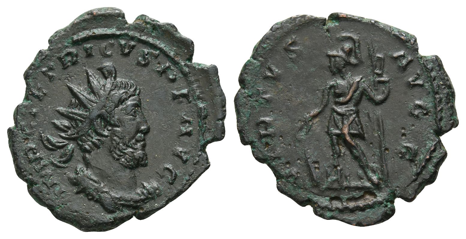 Treveri mint; struck AD 273. IMP C TETRICVS P F AVG, radiate, draped and cuirassed bust to right / VIRTVS AVGG, Mars standing to left, holding spear and shield. RIC V.2 148. 4.41gr, 23mm, 7h