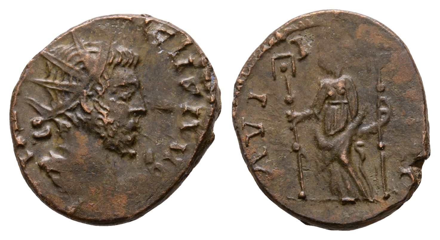 Local imitation. [...]ICVS AVG, radiate bust to right / ΛVI-I-[...]G, Fides standing facing, head to left, holding standard in each hand. For prototype, cf. RIC V.1 71 (FIDES MILITVM). 2.43gr, 18mm, 5h.