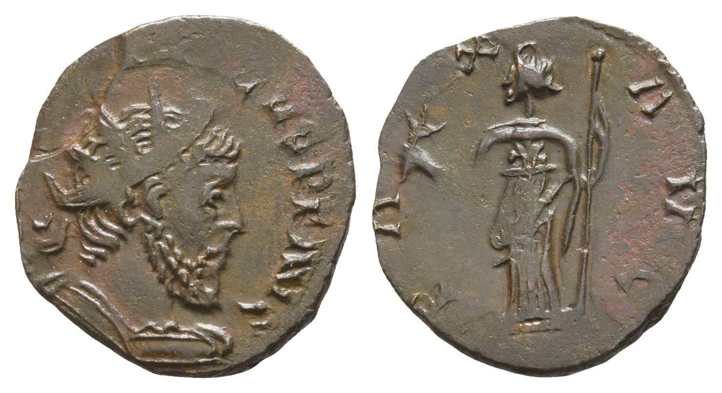 [...]CVS P F AVG, radiate, cuirassed bust to right / PAX AVG, Pax standing facing, head to left, holding olive branch with right hand and sceptre with left. For prototype, cf. RIC V.2 100. 1.60gr, 18mm, 5h.
