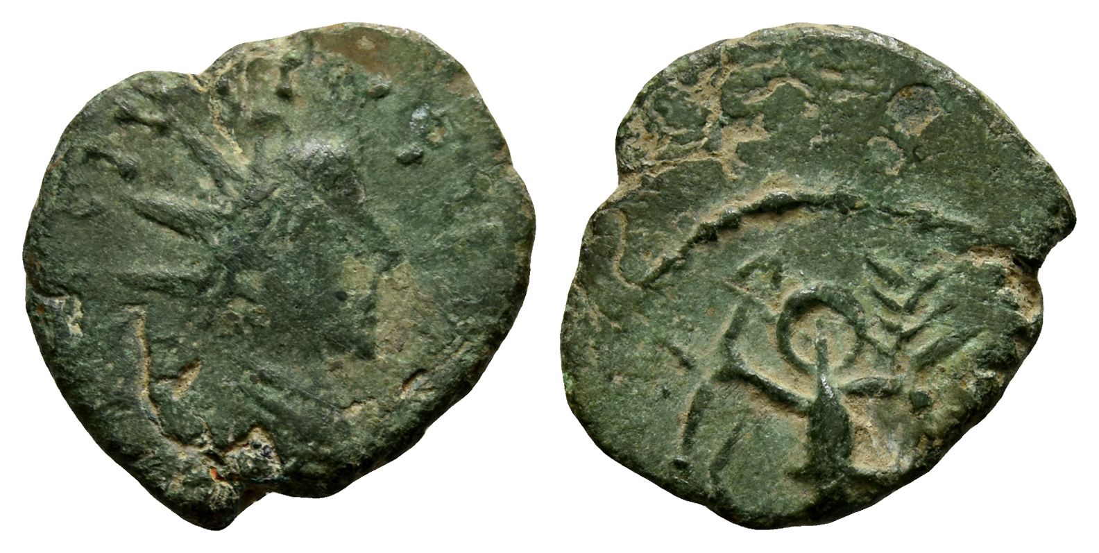 Uncertain British(?) mint. Contemporary local imitation. [...] PIVS [...], radiate and draped bust to right / Stylised figure standing facing, holding spear with right hand and branch with left. 1.77gr, 17mm, 3h.