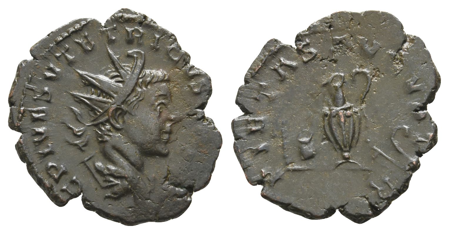 C PIV ESV TETRICVS CAES, radiate and draped bust to right / PIETAS AVGVSTOR, pontifical implements: sprinkler, simpulum, jug, knife, lituus. RIC V.2 258; RIC V.4 772-3 (knife not mentioned). 2.17gr, 19mm, 6h.