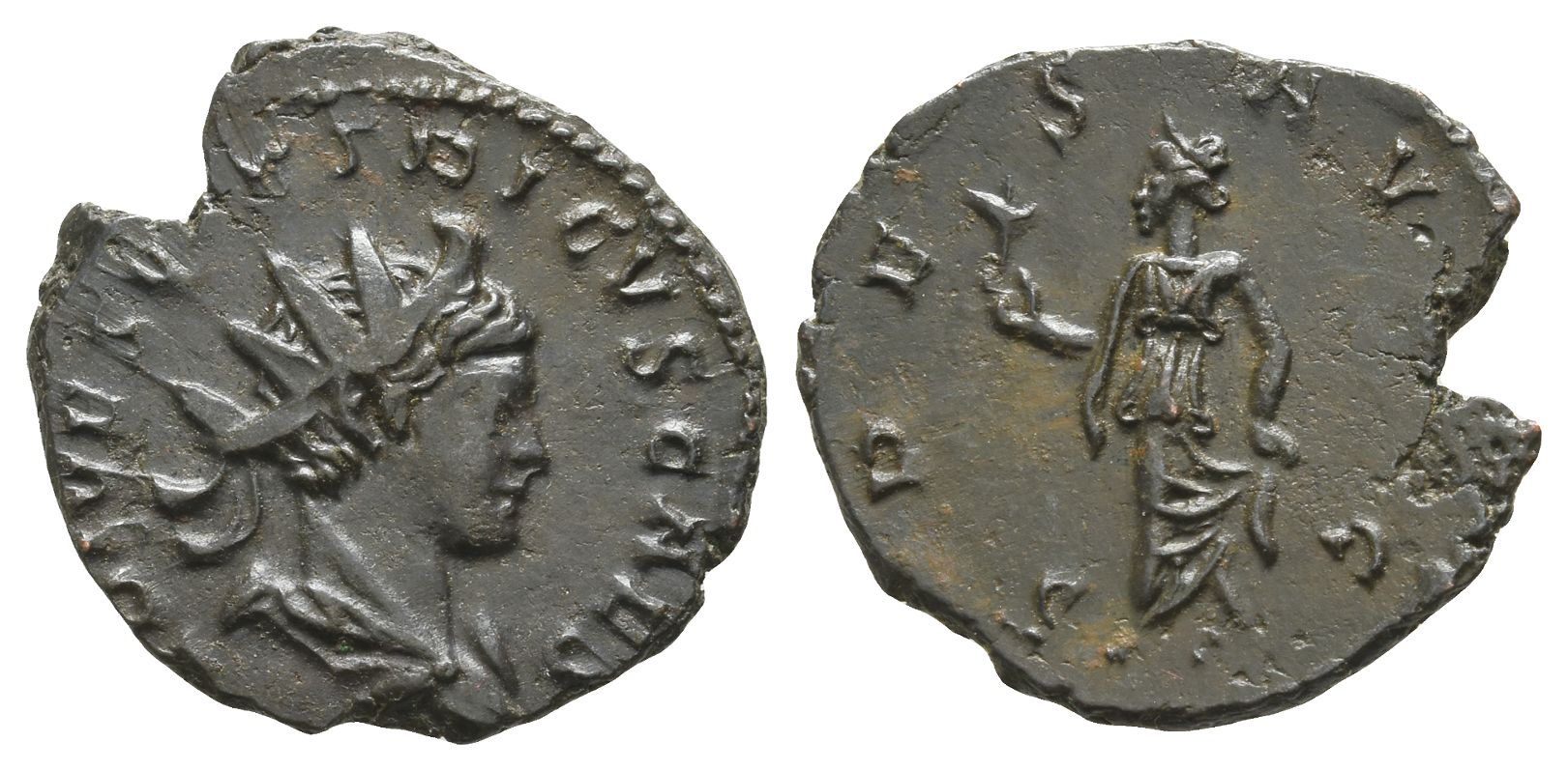 C PIV ESV TETRICVS CAES, radiate and draped bust to right / SPES PVBLICA, Spes walking to left, holding flower with right hand and raising robe with left. RIC V.2 272; RIC V.4 759. 3.09gr, 21mm, 11h.
