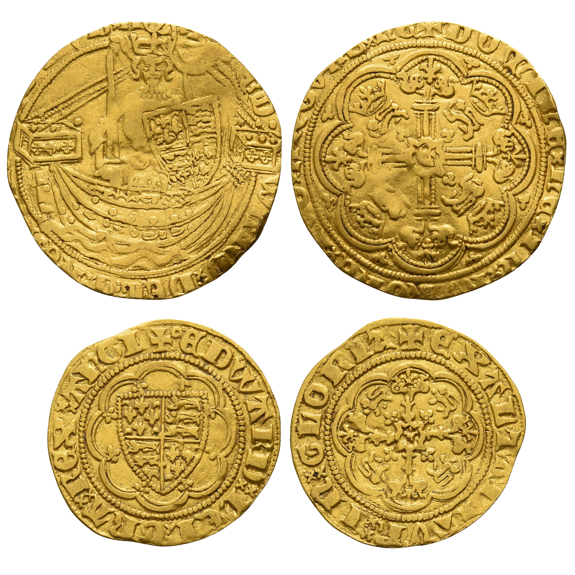 24, Gold half-noble of Edward III dated to 1363-1369, King on ship, holding sword and shield bearing the royal coat of arms. EDWARD DEI G REX [ANGL D HYB Z AQT] / Triple-stranded cross with ornate terminals, lion and crown in each angle, surrounding eight-arched tressure, E at centre of cross, DOMINE NE [IN FUROR TUO ARGUAS ME]. Diameter 24mm, weight 3.16gr. North 1238, SCBC 1506/7. Near very fine. Clipped. .