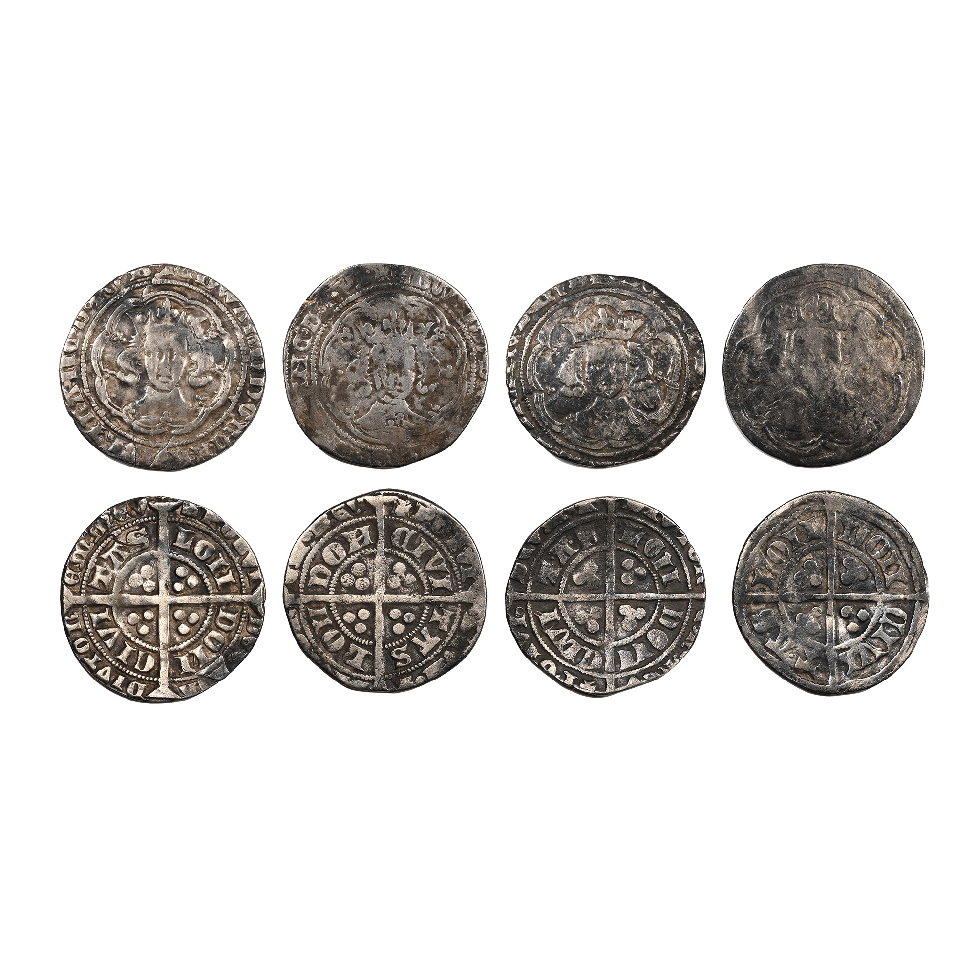10, Silver penny of Edward III (1327-1377) Dated to 1344-1351 Third (florin) coinage type 4, crowned bust facing forwards EDW R ANG[L DNS HYB] / Long cross with pellets in angles, quatrefoil in the centre Reverse inscription: [CIVI]TAS EBORA[CI]. Diameter 16mm, weight 0.83gr. North 1130.
