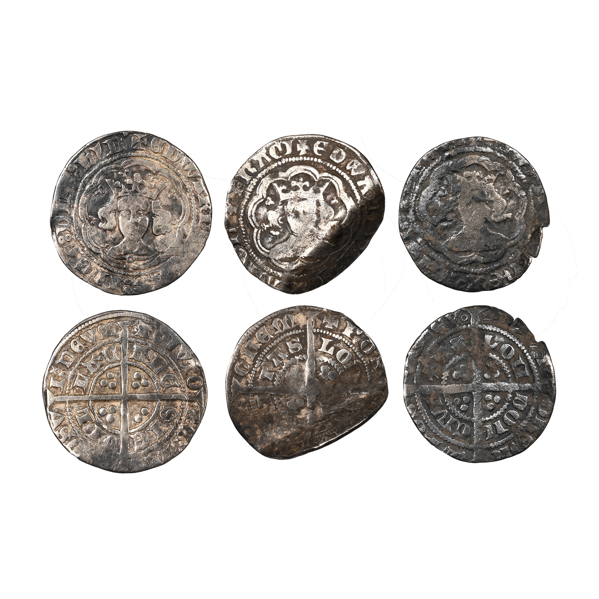 9, A heavily worn silver penny of Edward III Fourth coinage 1351-1377, crowned bust facing forwards [...] / Long cross (Crovier on one arm), three pellets in each angle, CIVITAS DU[REM]E. Diameter 17mm, weight 0.87gr.