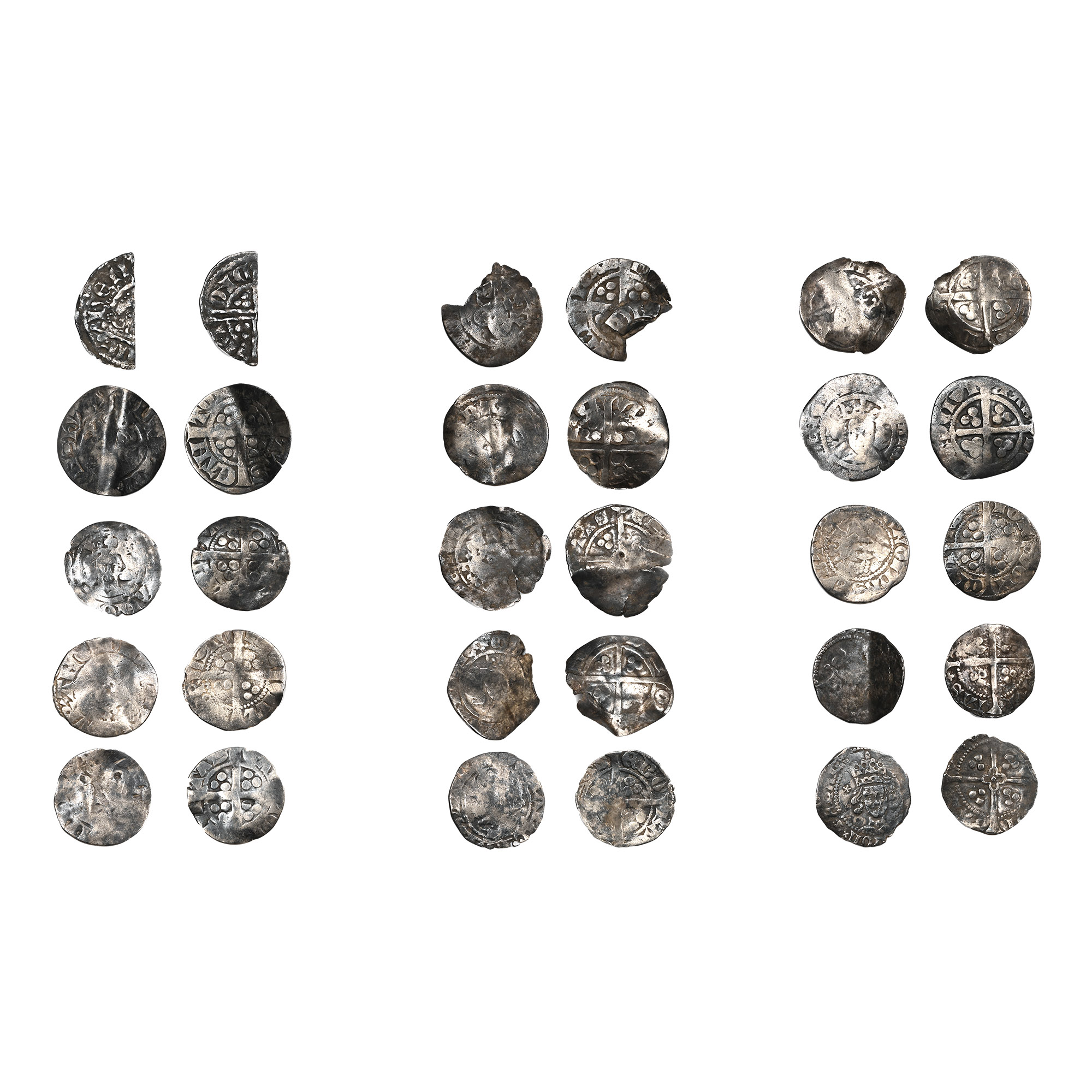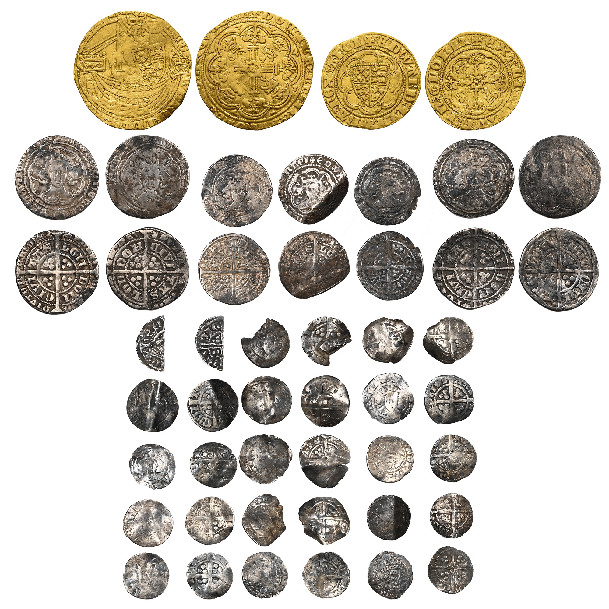 Hoard comprising of 24 coins: Henry III cut half penny, six Edward I pennies, Edward II penny, five Edward III pennies, three Edward III half groats, four Edward III groats, Edward III gold quarter noble, Edward III gold half Noble, two Henry V pennies: