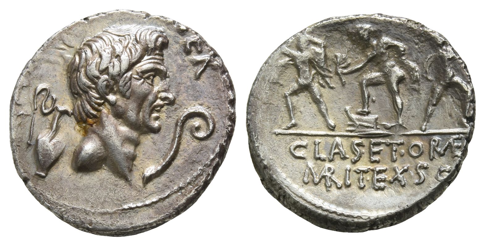 Uncertain Sicilian mint; struck 37-36 BC. [MAG PIVS IMP IT]ER, bare head of Cn. Pompeius Magnus to right; to left, capis; to right, lituus / [PRÆF] above, CLAS • ET • ORÆ MARIT • EX • S C (MAR ligate) in two lines beneath Neptune standing to left, holding aplustre in his right hand and resting his right foot on prow; to left and right, the Catanaean brothers Anapias and Amphinomus, with their parents on their shoulders, running in opposite directions. Crawford 511/3a; Sydenham 1344; Babelon (Pompeia) 27; RBW 1785. 3.78gr, 18mm, 9h.