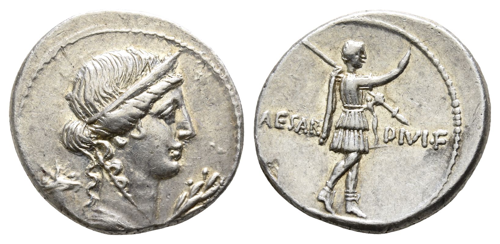 Diademed and draped bust of Pax to right; behind, cornucopia; before, olive branch / CAESAR DIVI • F, Octavian, in military attire, advancing to right, raising his right hand in adlocutio and holding inverted spear over his shoulder in his left. RIC I 253; CRI 400; RSC 72. 3.99gr, 19mm, 12h.