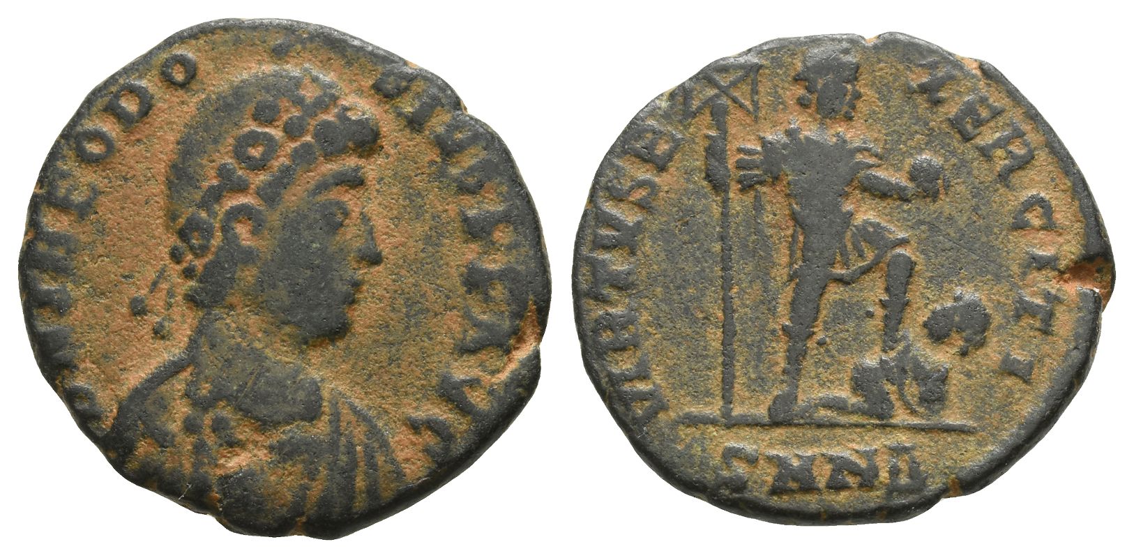 4th officina. D N THEODOSIVS P F AVG, pearl-diademed, draped and cuirassed bust to right / VIRTVS EXERCITI, emperor standing to right, holding labarum and globe, left foot on captive; SMNΔ in exergue. RIC IX 44b. 5.00gr, 22mm, 6h.