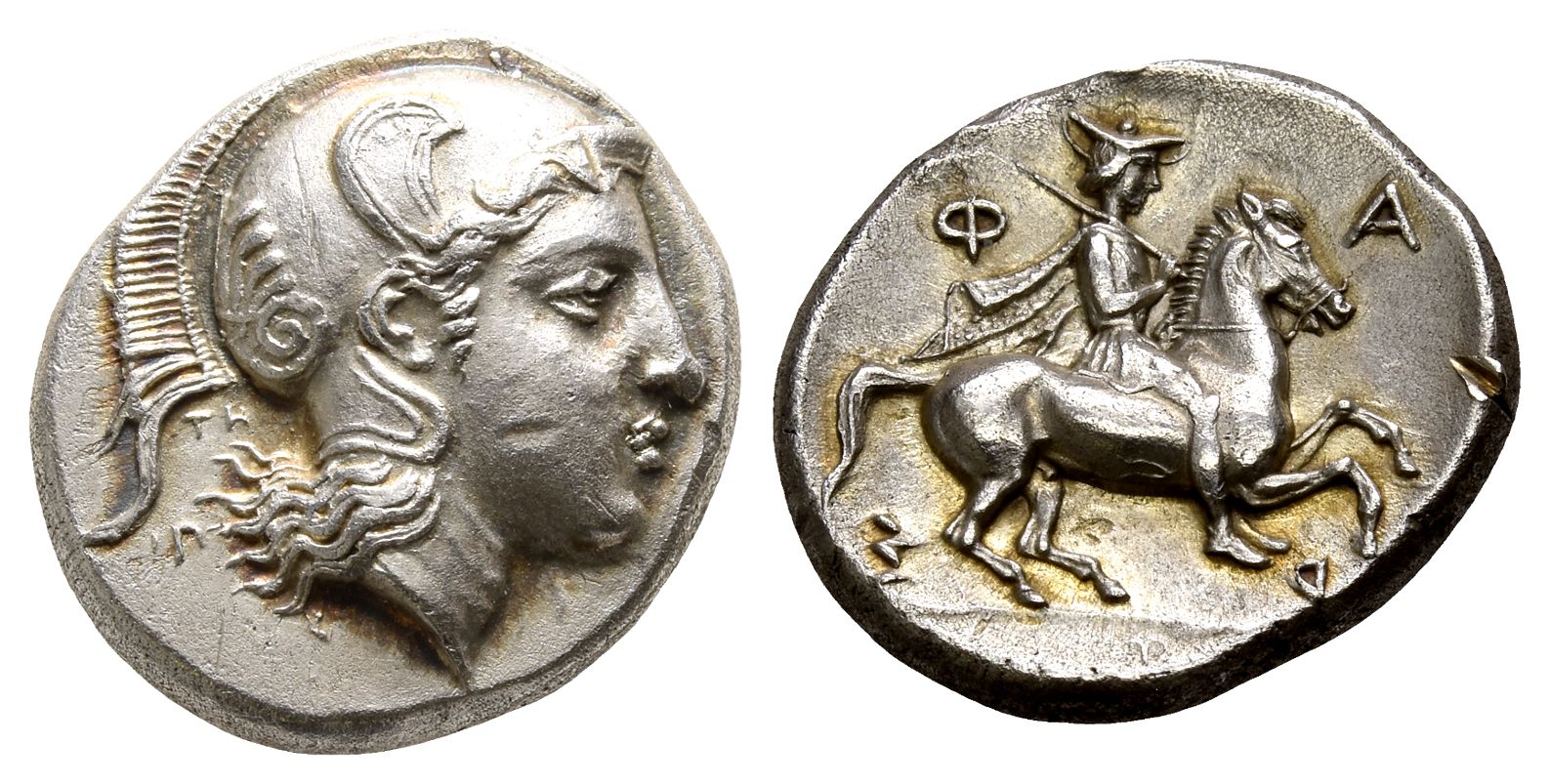 Signed by the engraver ΤΗΛΕΦΑΝΤΟΣ (Telephantos) and ΙΠ- (Ip-). Head of Athena to right, wearing crested Attic helmet with raised cheek pieces; behind neck, ΤΗ above ΙΠ (engravers' initials) in small lettering / Φ-Α-Ρ-Σ clockwise around Thessalian cavalryman riding horse prancing to right, wearing petasos, chlamys and chiton, and holding lagobolon over his right shoulder; in exergue, Τ (engraver's initial). Lavva 86 (O43/R51); BCD Thessaly I 1284 var. (TH in exergue); BCD Thessaly II 639 var. (no ΙΠ); HGC 4, 624. 5.95gr, 18mm, 9h.