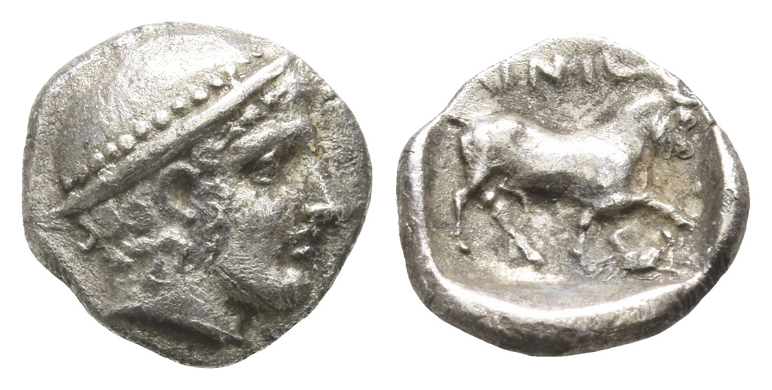 Head of Hermes to right, wearing petasos / Goat walking to right; AINI above, crab below foreleg. May 292-309; HGC 3.2, 1277. 1.18gr, 12mm, 6h.