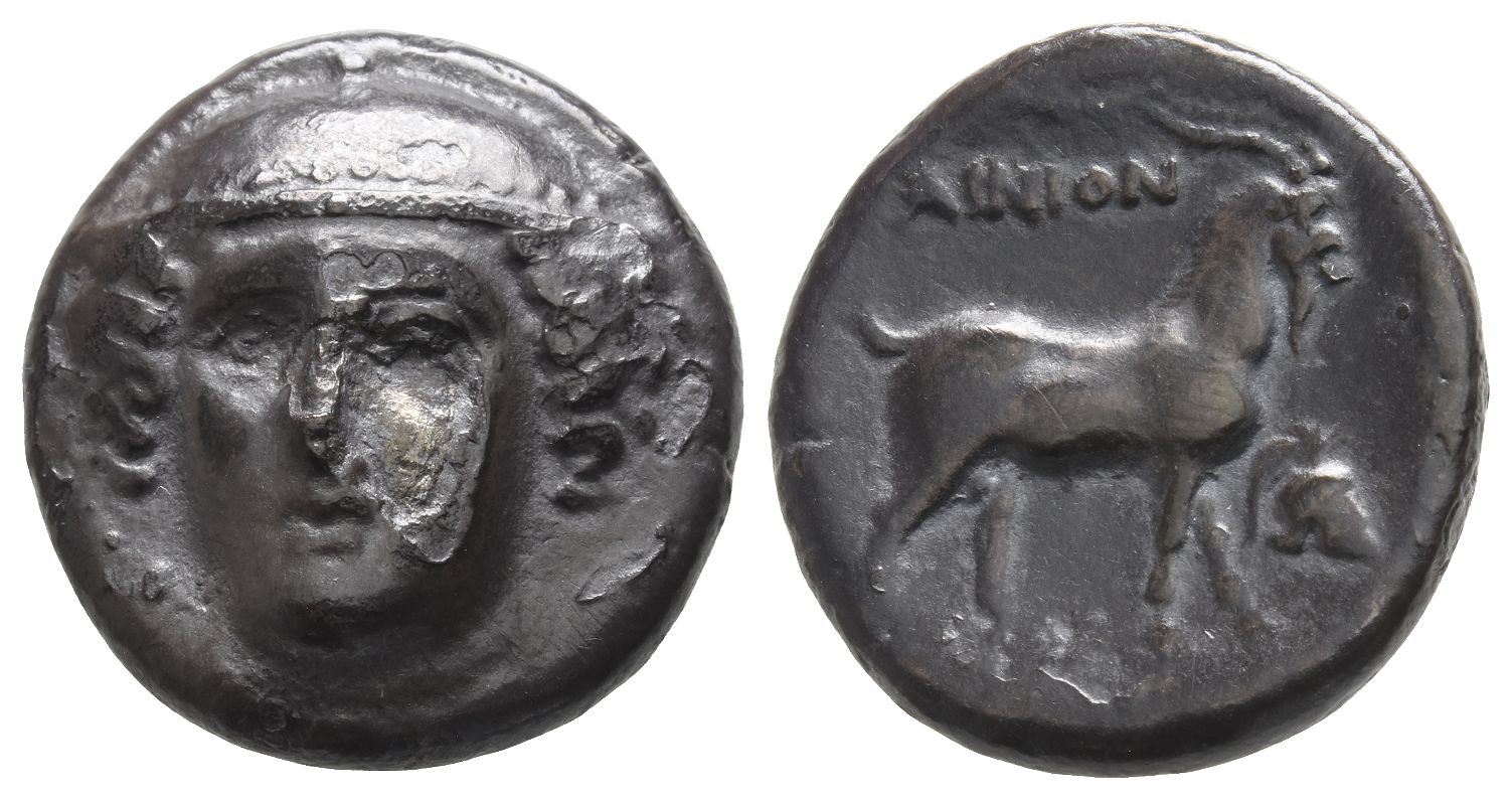 Head of Hermes facing three-quarters to left, wearing petasos / Goat standing to right; AINION above, Corinthian helmet before. May 413 (A.249/P.292); HGC 3.2, 1278. 14.68gr, 25mm, 12h.