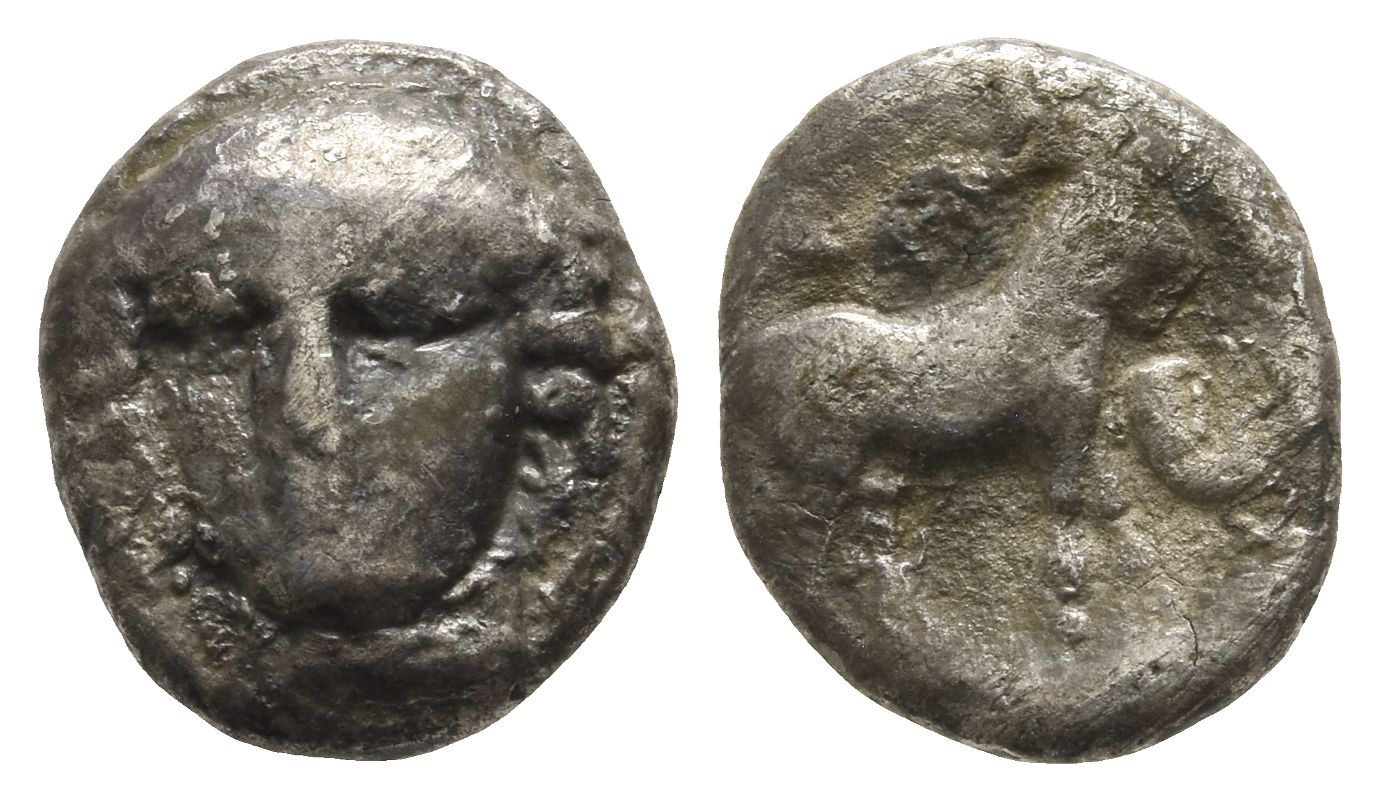 Head of Hermes facing three-quarters to left, wearing petasos / Goat standing to right; [ethnic] above, rhyton before. May, Ainos 364; cf. HGC 3.2, 1281. 2.02gr, 14mm, 12h.