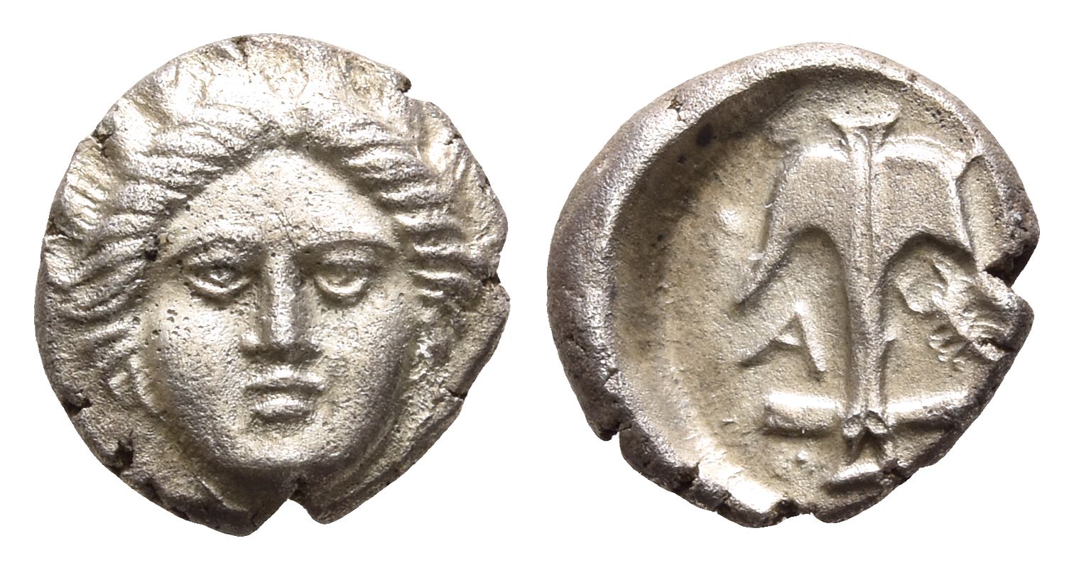 Facing gorgoneion / Upright anchor; A to left, crayfish to right. Topalov, Apollonia 56; SNG BM Black Sea 167. 1.29gr, 11mm, 3h.