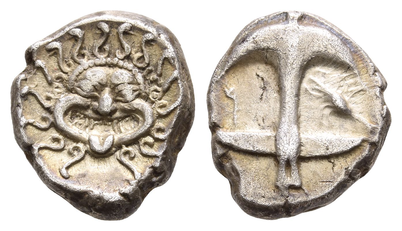 Thraco-Macedonian standard. Facing gorgoneion / Upright anchor; crayfish to right. Topalov, Apollonia 41; HGC 3, 1323; SNG Ruse 106-117. 3.30gr, 14mm, 12h.