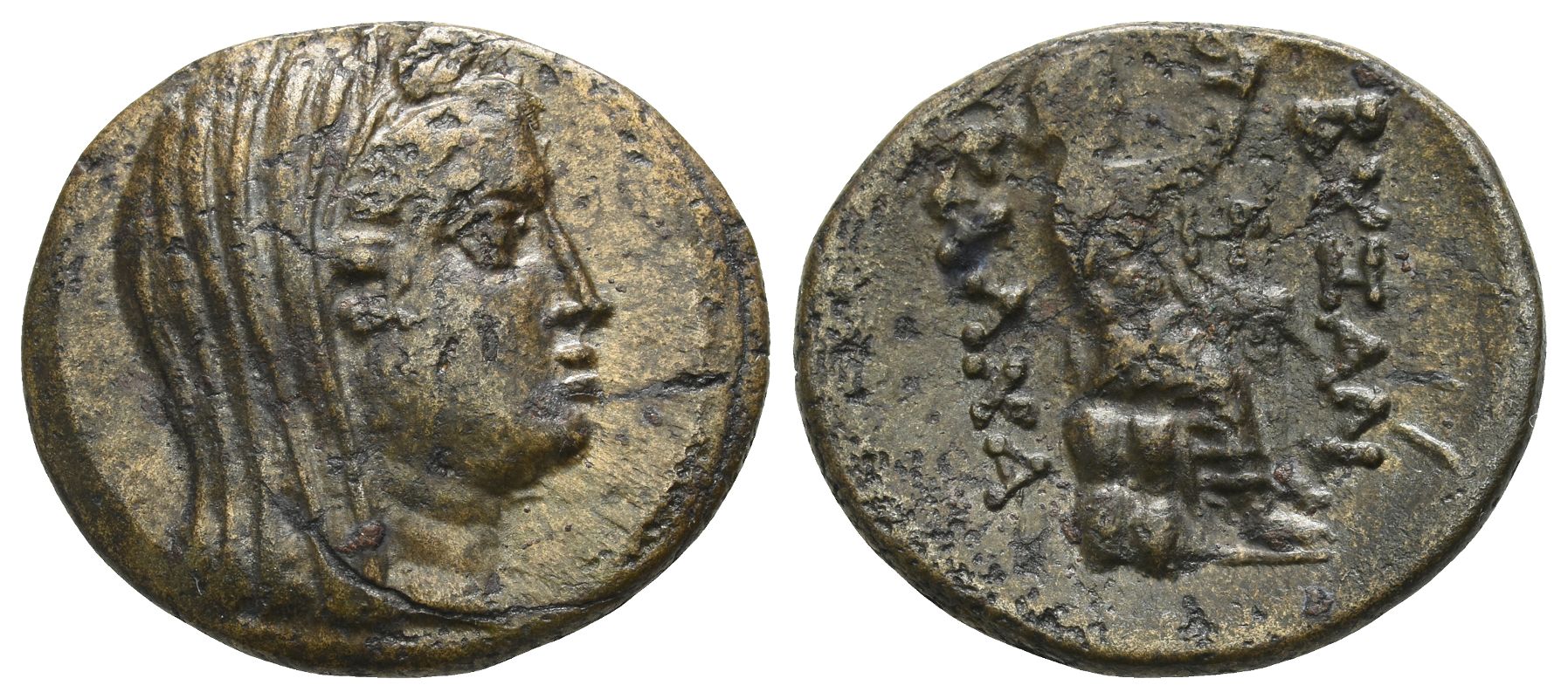 Veiled and wreathed head of Demeter to right / ΒΥZΑN ΚΑΛΧΑ, Poseidon seated to right on rock, holding aphlaston with right hand and transverse trident with left; HP monogram in inner right field. Schönert-Geiss 1263-1270; HGC 3.2, 1428. 9.14gr, 26mm, 12h.