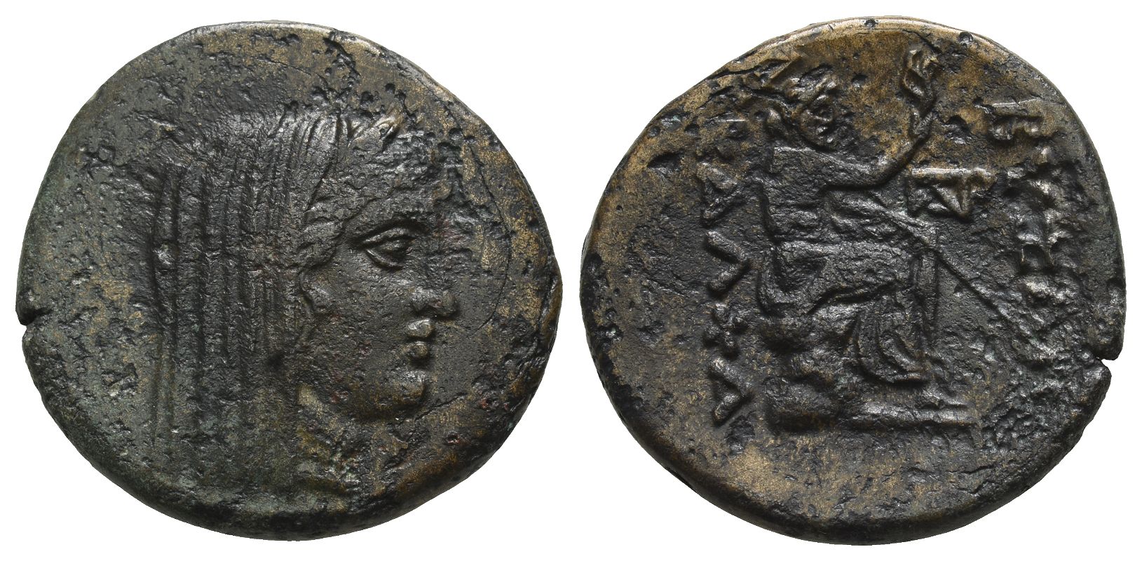 Veiled and wreathed head of Demeter to right / ΒΥZΑN ΚΑΛΧΑ, Poseidon seated to right on rock, holding aphlaston with right hand and transverse trident with left; ΠΑΡ monogram in inner right field. Schönert-Geiss 1271-1275; HGC 3.2, 1428. 10.10gr, 26mm, 12h.
