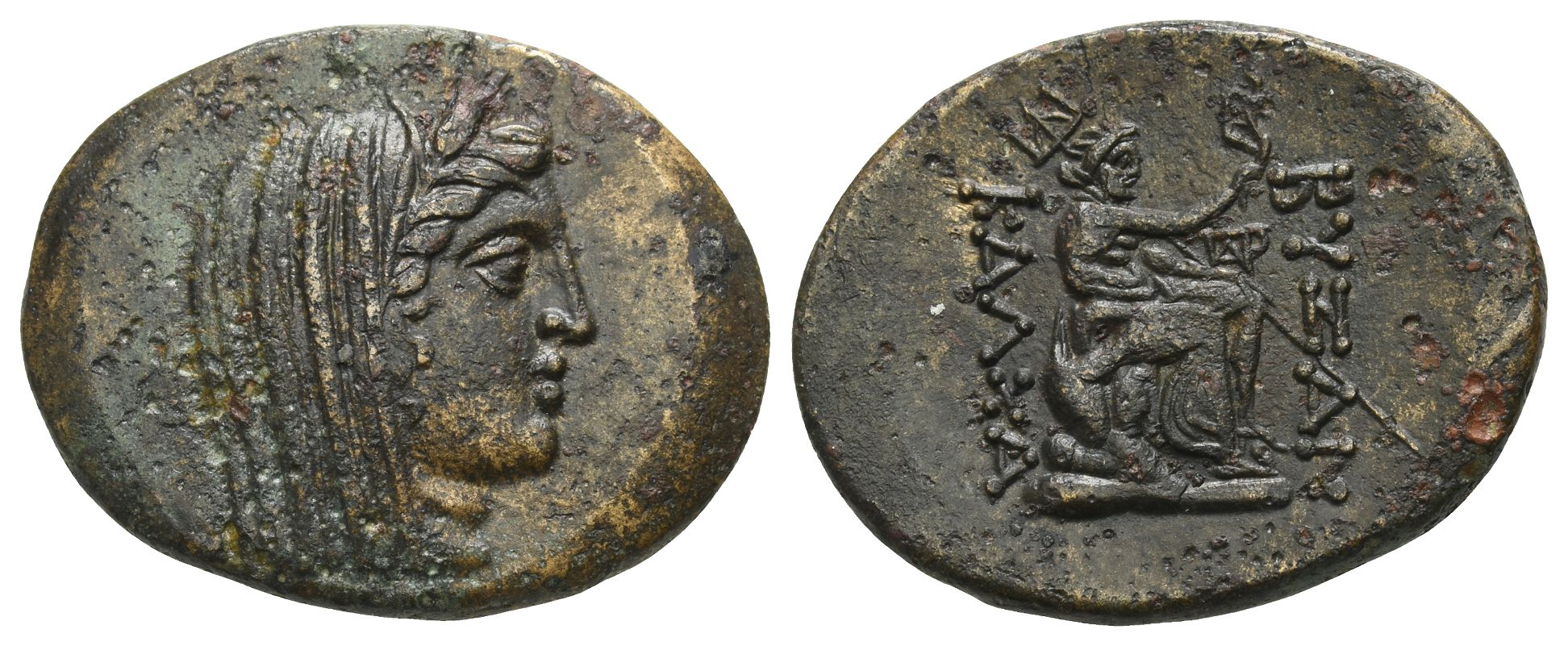 Veiled and wreathed head of Demeter to right / ΒΥZΑN ΚΑΛΧΑ, Poseidon seated to right on rock, holding aphlaston with right hand and transverse trident with left; ΠΑΡ monogram in inner right field. Schönert-Geiss 1271-1275; HGC 3.2, 1428. 9.37gr, 28mm, 12h.