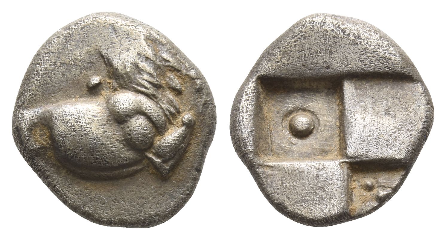 Forepart of lion to right, head reverted to left / Quadripartite incuse square with alternating raised and sunken quarters; pellet and uncertain design in opposite sunken quarters. HGC 3.2, 1437. 2.28gr, 17mm, 12h.