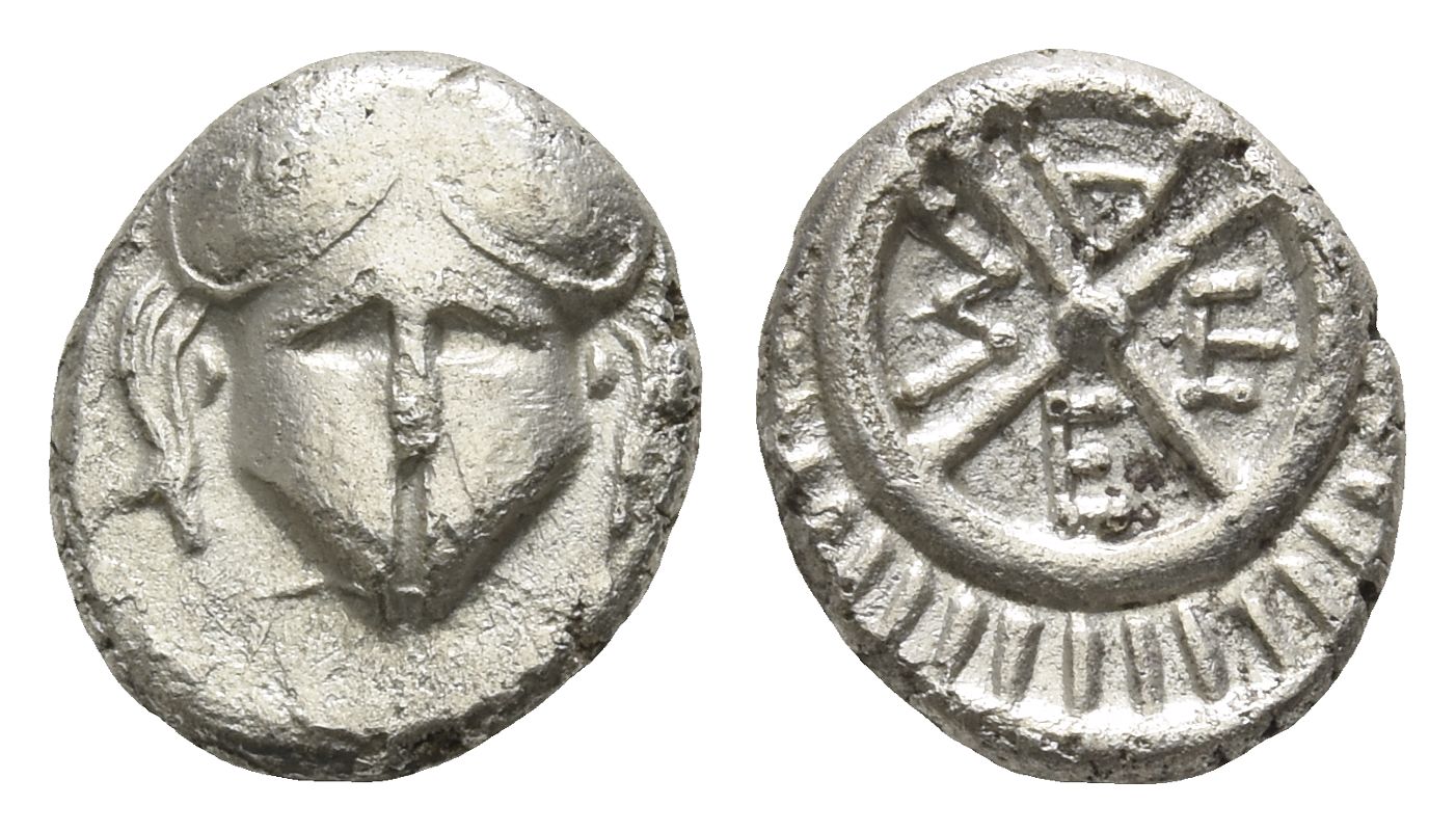 Crested helmet facing / M-E-T-A within spokes of wheel; rays around. Karayotov I 37-94; HGC 3, 1560. 1.15gr, 11mm, 12h.