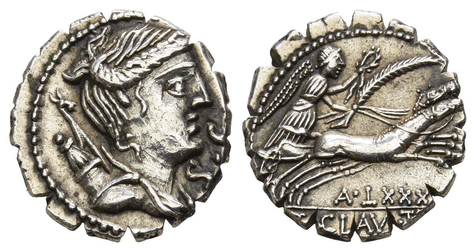 Rome mint. Diademed and draped bust of Diana to right, with bow and quiver over shoulder; S • C before / Victory driving galloping biga to right, holding reins, palm frond and wreath; A • LXXX[...] below, T [•] CLAV[D] • T[I • F AP • N] in exergue. Cf. Crawford 383/1; cf. RSC Claudia 6. 3.71gr, 17mm, 6h.