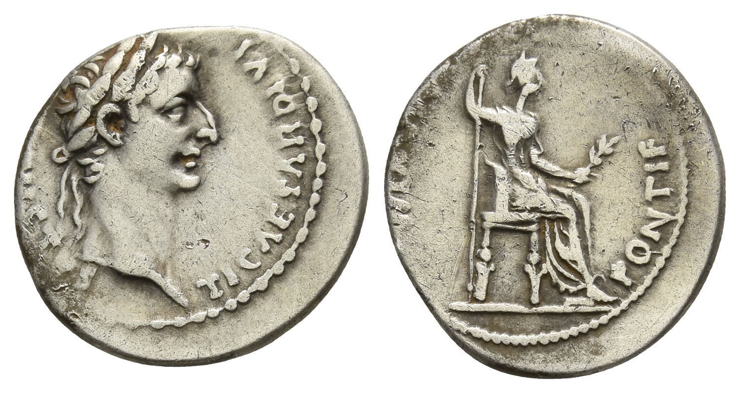 TI CAESAR DIVI [AVG F AVG]VSTVS, laureate head to right / PONTIF MAXIM, Livia as Pax seated to right on chair with ornamented legs, her legs draped resting on footstool, holding sceptre and branch; on singular exergual line. RIC I 30 corr. (ornamented legs); BMCRE 48; RSC 16a. 3.72gr, 18mm, 4h.