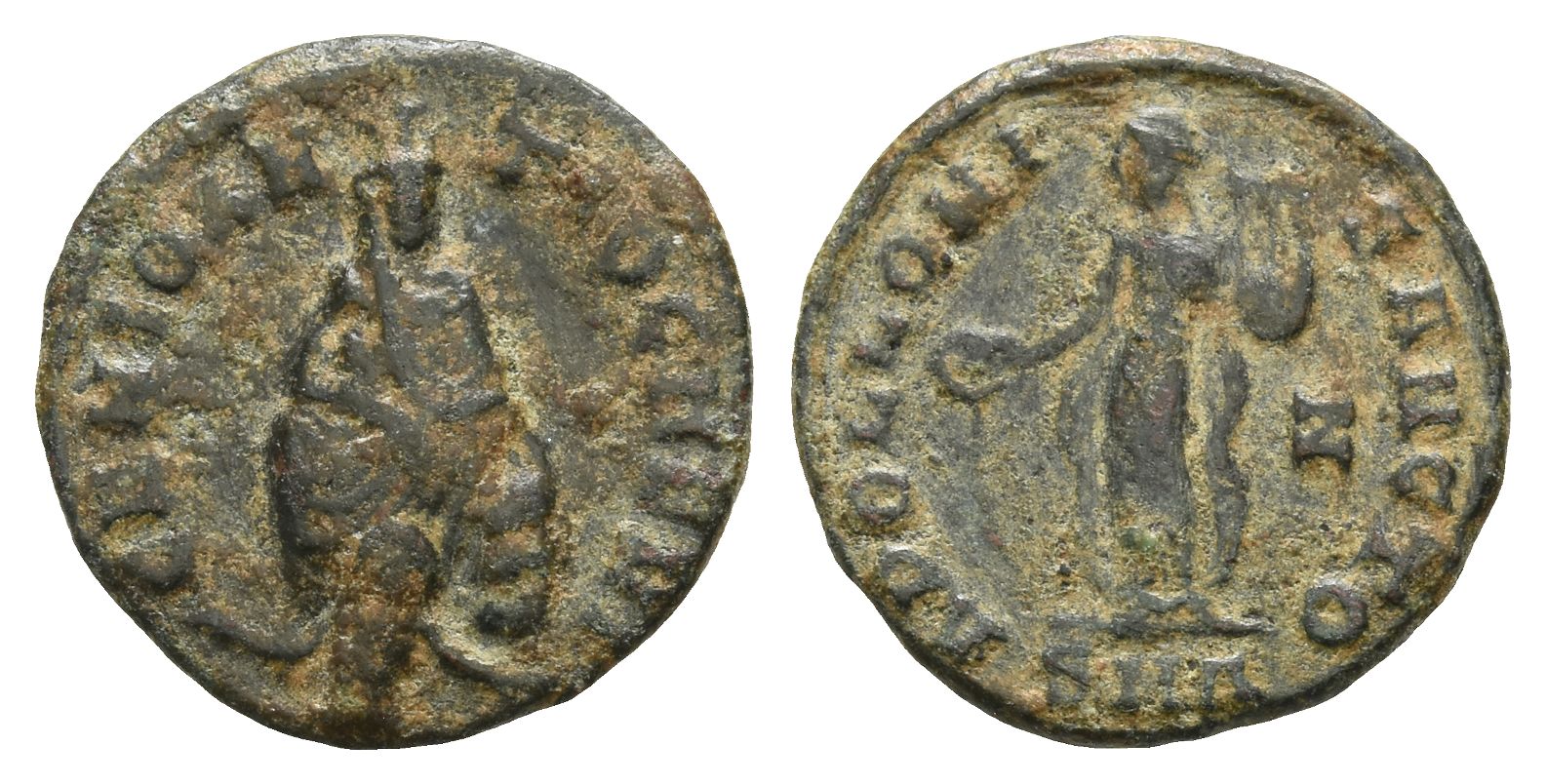 Antioch mint; struck circa AD 312. 7th officina. 'Persecution Issue'. GENIO AN-TIOCHENI, Tyche seated facing, river-god Orontes swimming below / APOLLONI SANCTO, Apollo standing to left, holding patera and lyre; Z in right field, SMA in exergue. McAlee 170; Vagi 2954; Failmezger 229. 1.62gr, 15mm, 11h.