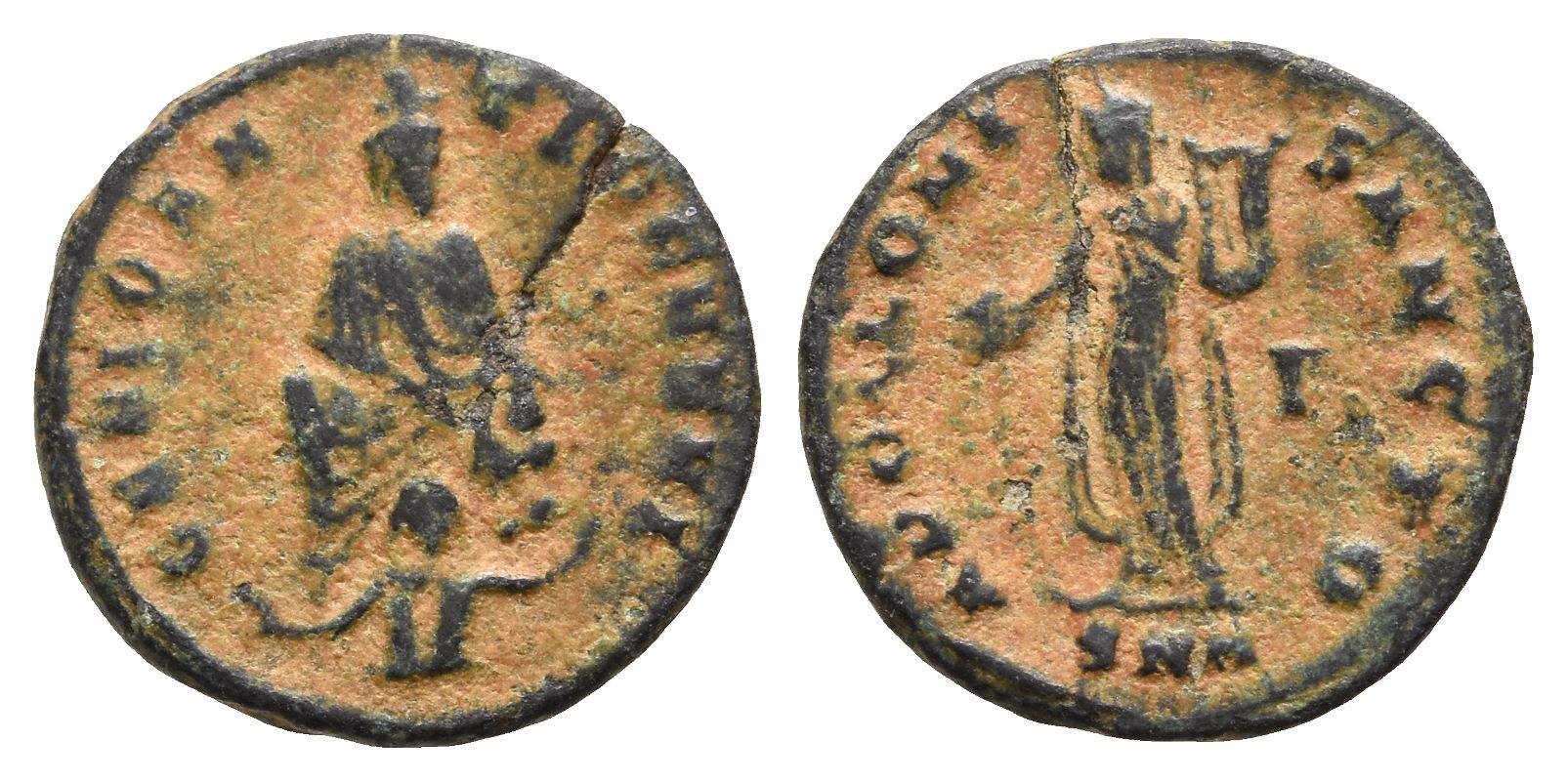 3rd officina. GENIO AN-TIOCHENI, Tyche seated facing, river-god Orontes swimming below / APOLLONI SANCTO, Apollo standing to left, holding patera and lyre; Γ in right field, SNA in exergue. Vagi 2954. 1.41gr, 16mm, 12h.