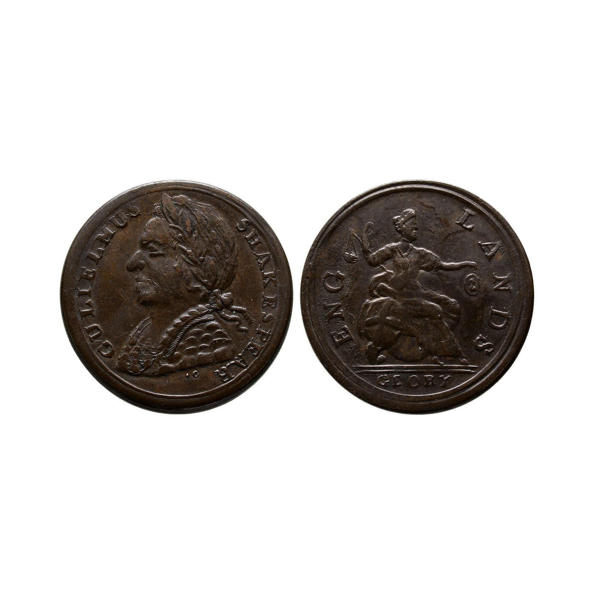 Obv: bust facing left with GULIELMUS SHAKESPEAR legend. Rev: ENGLANDS GLORY around Britannia seated right. 7.39 grams, 27 mm.
