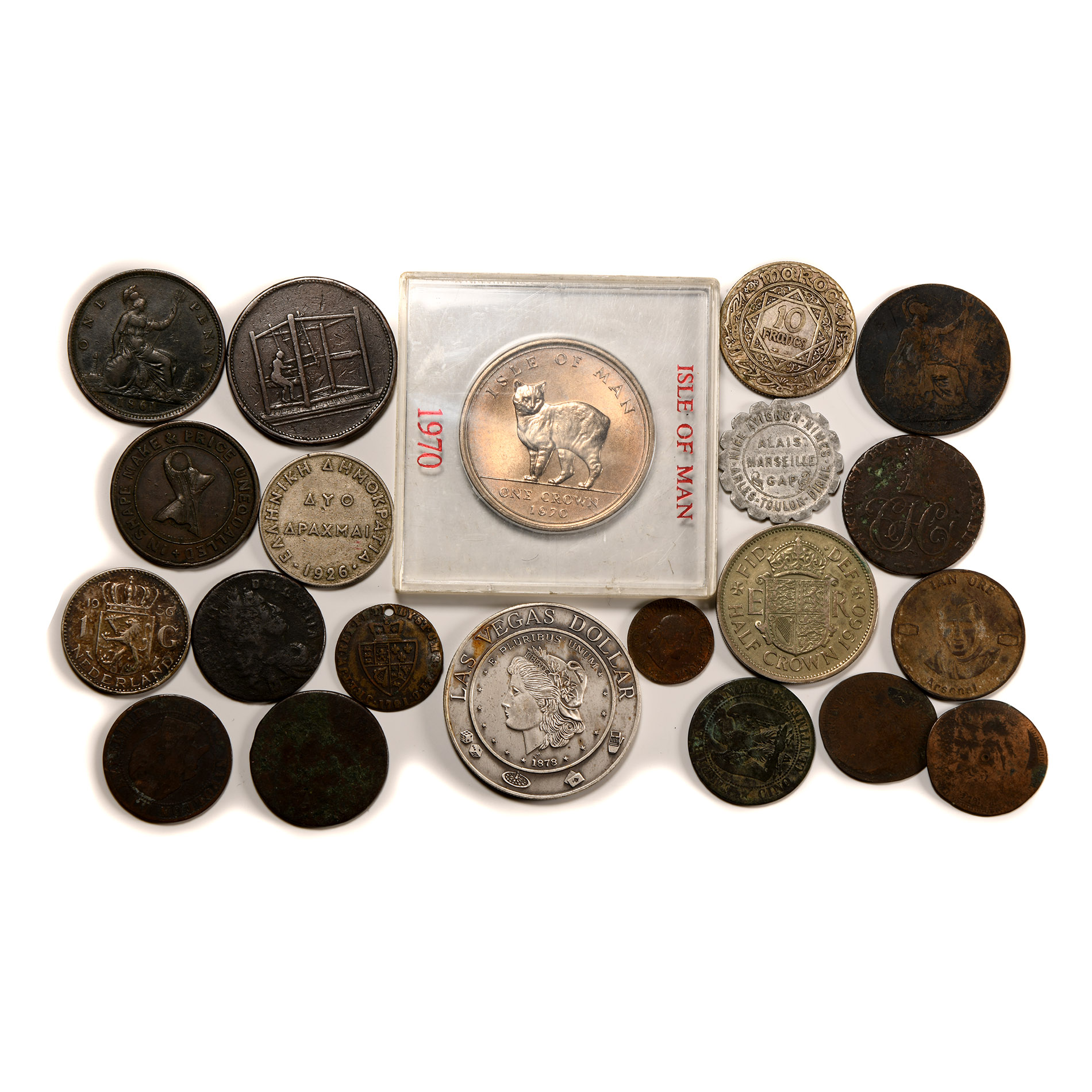 Mixed group of silver and bronze coins and tokens comprising: various countries, monarchs, issues, and dates. 211 grams total, 17-38 mm.