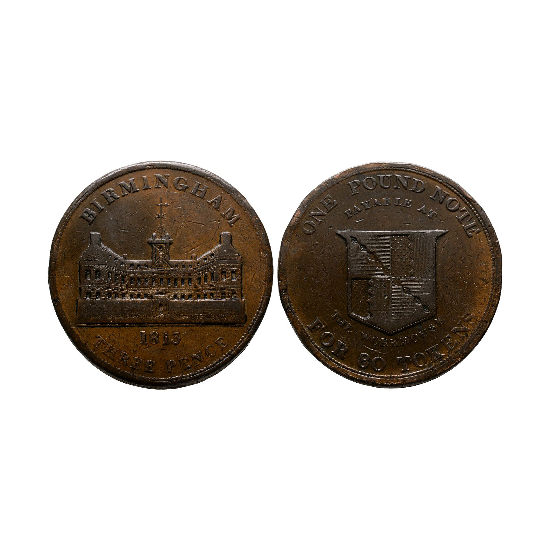 Obv: west view of the Birmingham Workhouse with legend: BIRMINGHAM 1813 THREE PENCE, denomination and date below. Rev: central shield with legend above and below: ONE POUND NOTE FOR 80 TOKENS PAYABLE AT THE WORKHOUSE. 70.25 grams, 44 mm.