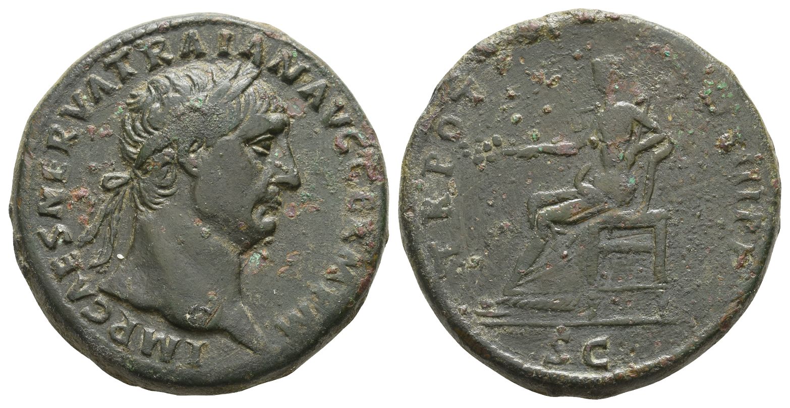 IMP CAES NERVA TRAIAN AVG GERM P M, laureate head to right / TR POT [COS] III P P, Pax seated to left, holding branch and sceptre; S C in exergue. RIC II 413; Cohen 624; BMCRE 731 note; Woytek 76a. 29.37gr, 34mm, 6h.