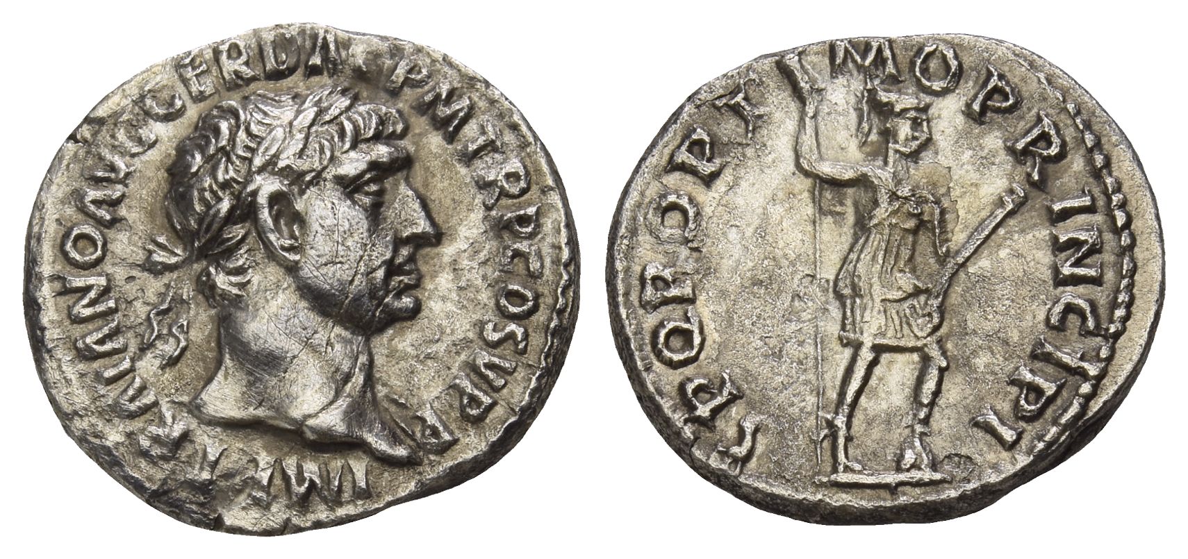 Rome mint; struck AD 103-107. IMP TRAIANO AVG GER DAC P M TR P COS V P P, laureate head to right, slight drapery on far shoulder / S P Q R OPTIMO PRINCIPI, Virtus standing to right, holding spear and parazonium, with foot on helmet. RIC II 204; BMCRE 230 corr.; Woytek 197b; RSC 402a. 3.19gr, 18mm, 7h