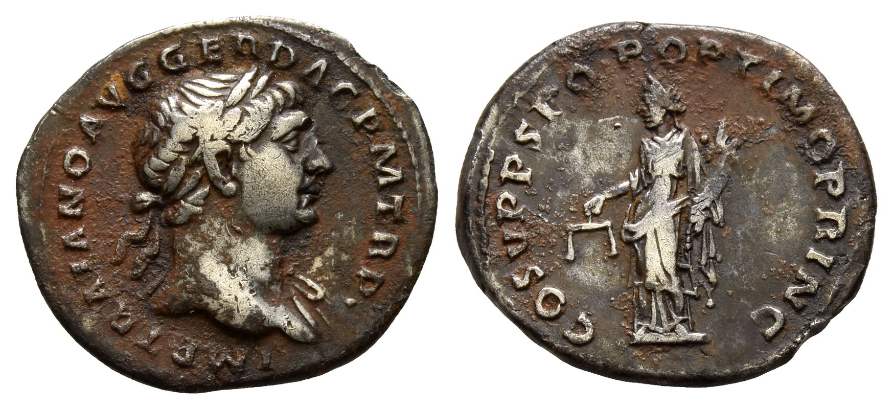 Rome mint; struck AD 108-109. IMP TRAIANO AVG GER DAC P M TR P, laureate bust to right, slight drapery on far shoulder / COS V P P S P Q R OPTIMO PRINC, Aequitas standing to left, holding scales with right hand and cornucopiae with left. RIC II p. XIV, addenda to p.252; BMCRE 281; Woytek 278b; RSC 85. 3.02gr, 20mm, 6h.