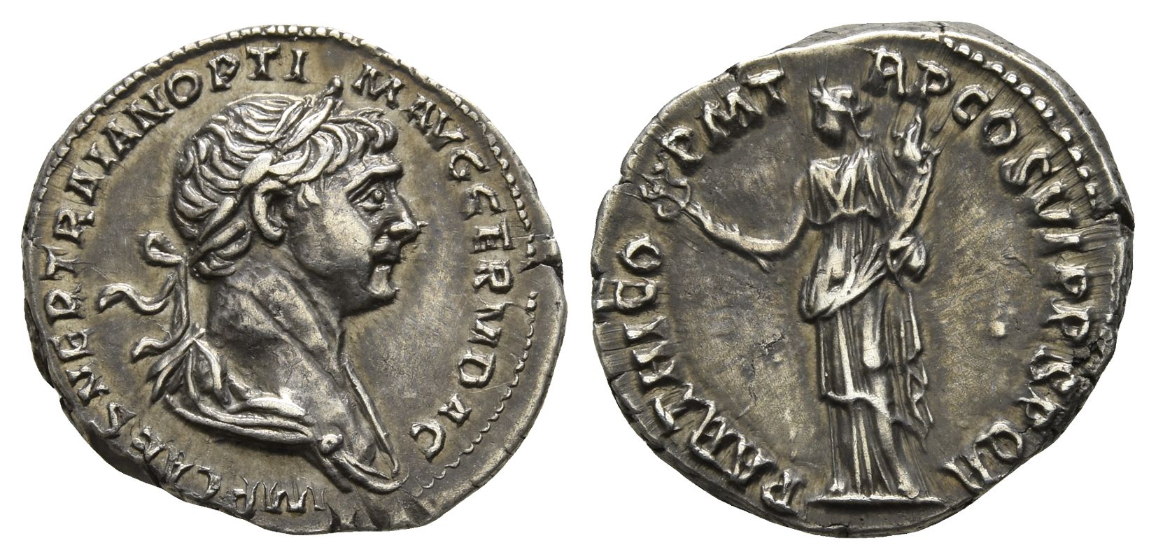 Rome mint; struck AD 116-117. IMP CAES NER TRAIAN OPTIM AVG GERM DAC, laureate and draped bust to right / PARTHICO P M TR P COS VI P P S P Q R, Felicitas standing to left, holding caduceus and cornucopiae. RIC II 332; Woytek 570v; BMCRE 627; RSC 191. 3.41gr, 19mm, 6h.