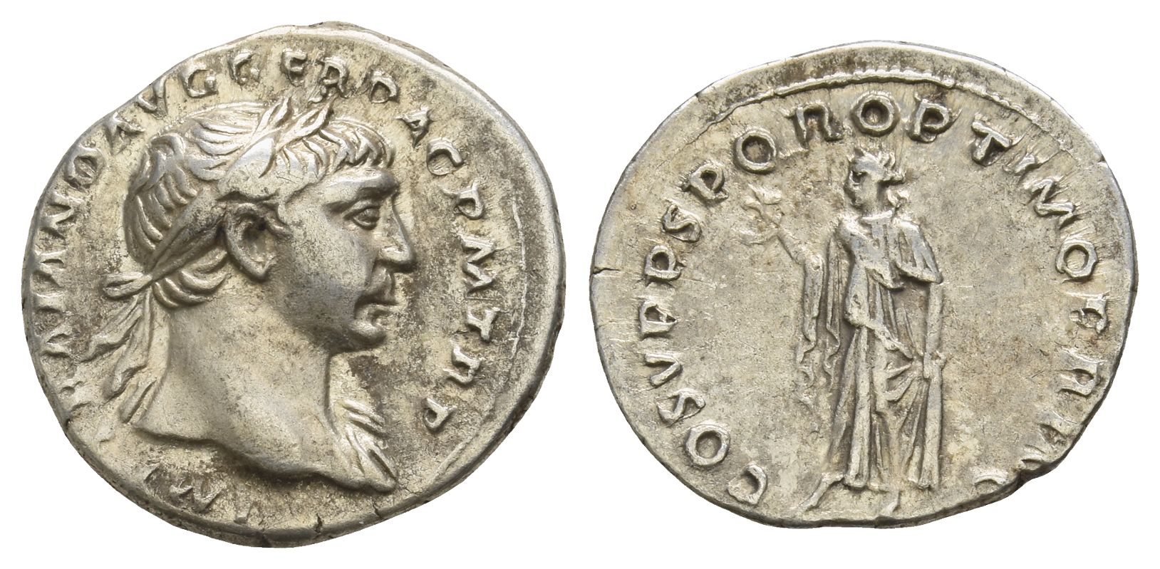 Rome mint; struck AD 107-108. IMP TRAIANO AVG GER DAC P M TR P, laureate bust to right, slight drapery on far shoulder / COS V P P S P Q R OPTIMO PRINC, Spes advancing to right, holding flower and raising skirt. RIC II 127 var. (bust type); BMCRE 319-321; Woytek 266b; RSC 84. 3.51gr, 19mm, 8h.