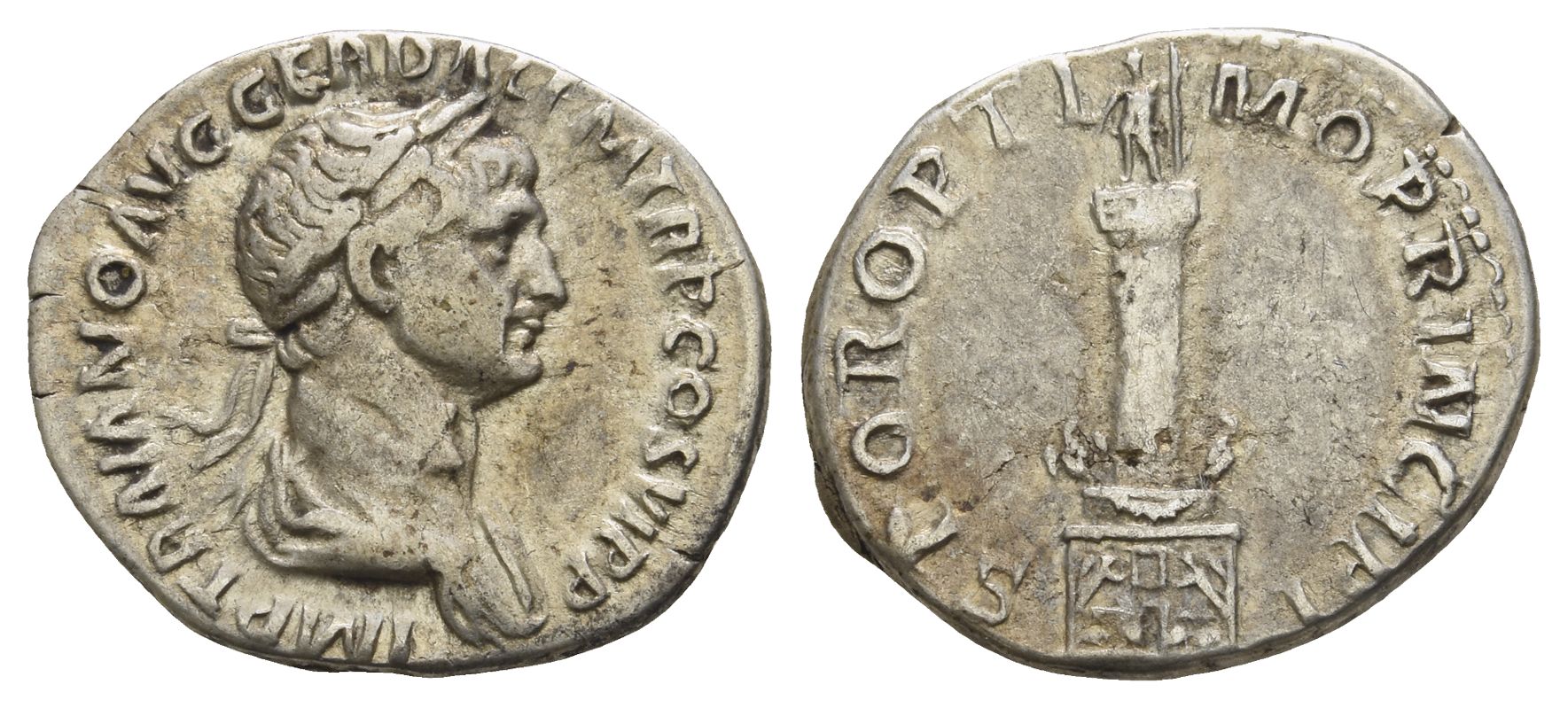 Rome mint; struck circa AD 112-114. IMP TRAIANO AVG GER DAC P M TR P COS VI P P, laureate and draped bust to right / S P Q R OPTIMO PRINCIPI, Trajan's Column surmounted with statue of the Emperor; at base, two eagles. RIC II 292; BMCRE 454; Woytek 425v; RSC 558. 3.39gr, 20mm, 7h.