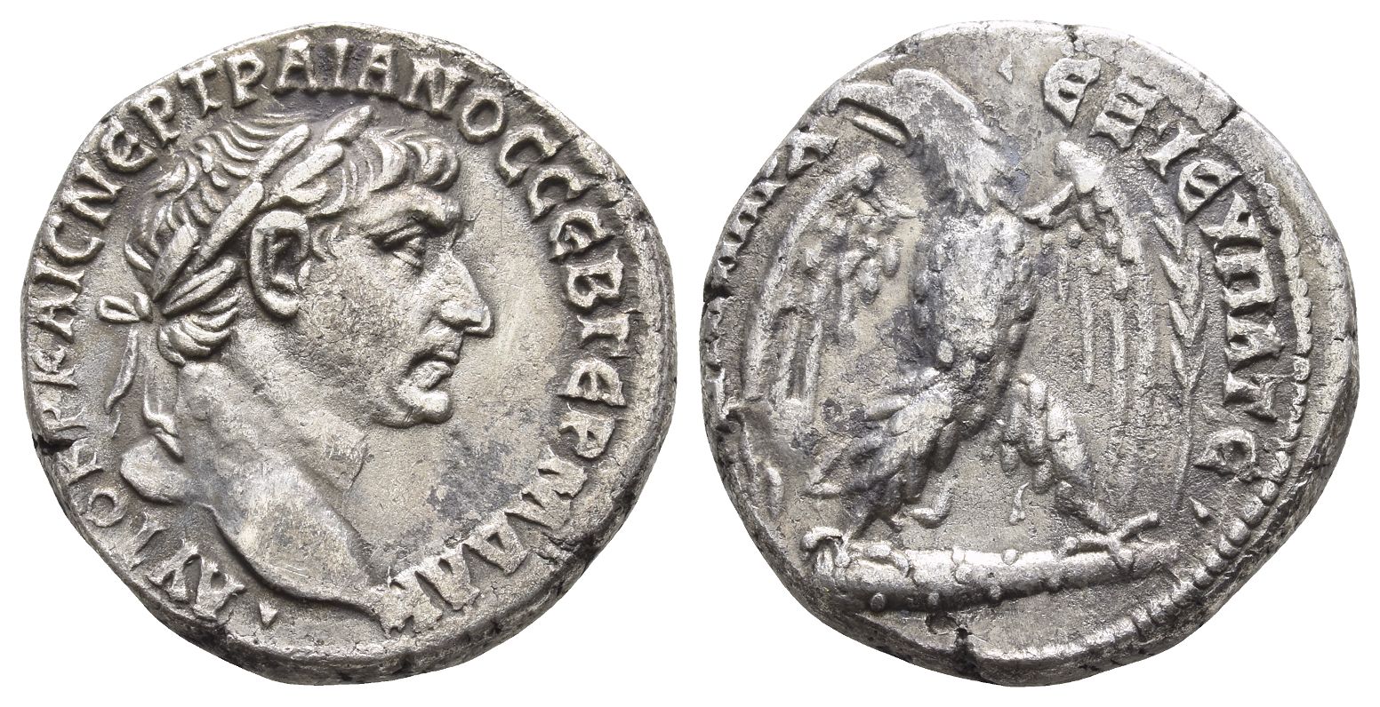 Trajan AR Tetradrachm of Antioch, Seleucis and Pieria. Tribunicia Potestas XV Consul V (AD 110/11).